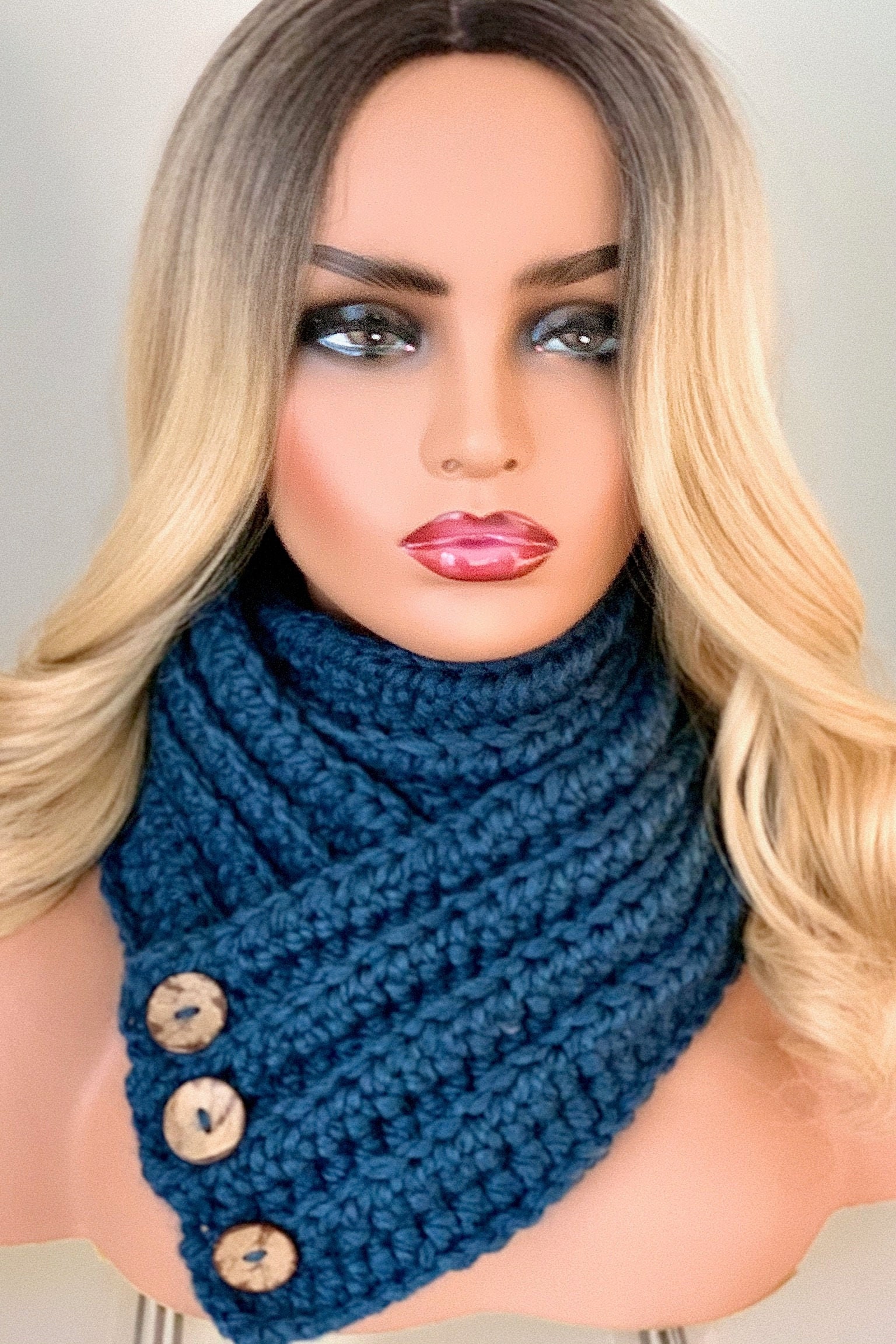 This chunky button scarf is made with 80% Acrylic yarn and 20% wool. Comes in a beautiful Blue Denim color, finished with three large coconut buttons. Perfect for those cool crisp fall days, and warm and cozy for the winter. If you want to wear it like the picture you would put it on your neck with the 2 long ends down your back, wrap the left scarf tail around your neck to the right, and the right scarf tail to your left and secure with the buttons.